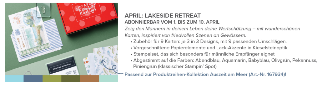 Ab 1. April – 10. April kannst du schon deíne erste Paper Pumpkin Box abonnieren. Schaue dir gerne oben nochmal die Details zum LAKESIDE RETREAT SET für April an.
