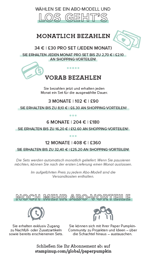 • Das Treue-Abo (Vorausbezahlt): Du möchstest dich mit mir auf das Abenteuer Paper Pumpkin länger einlassen? Dann sichere dir direkt 3, 6 oder 12 Monate Bastelspaß am Stück. Das Abo kann danach wieder verlängert werden. Hinweis: es wird nicht automatisch verlängert. Übrigens kannst du bei dieser Option nach der ersten Lieferung ebenfalls jederzeit pausieren. Z.B. einen Monat auslassen, weil du im Urlaub bist.